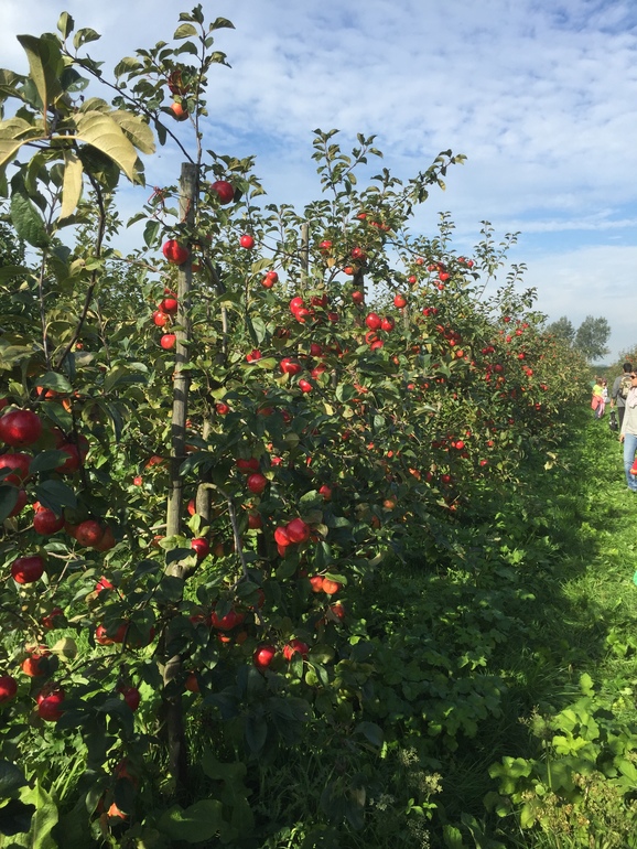 Первый раз в этом году ездили собирать яблоки и груши, остались очень довольны. За 5 минут можно собрать полный пакет. Яблони больше похожи на помидорные кусты - ростом с человека и невероятным количеством яблок на ветках.
