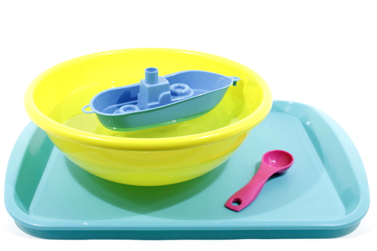 Наберите в таз воду. Положите на поверхность воды пластмассовую формочку. Начните понемногу наливать в нее воду ложкой до тех пор, пока формочка не погрузится в воду. Позвольте малышу повторить все действия самостоятельно.
