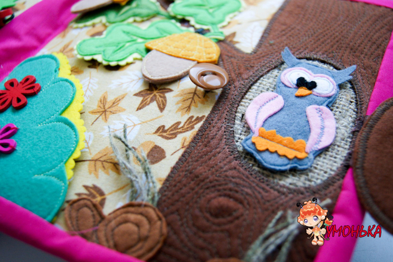 Помните, где грибок был маленький, и под ним от дождя спрятался муравей. Потом туда пришли еще бабочка, воробей, зайка и мышка. За кустиком прячется коварная лисица. Все игрушечки пальчиковые. Вы не просто показываете малышу сказку, вы развиваете воображение, мелкую моторику, память (когда малыш сам начнет показывать Вам представление, пересказывая историю). В дупле прячется красавица-сова (отрабатываем умение застегивать и расстегивать пуговицу со свободной петлей) Желуди на крючках. Чтобы их снять и одеть на крючок малышу придется тоже немало потренироваться=)