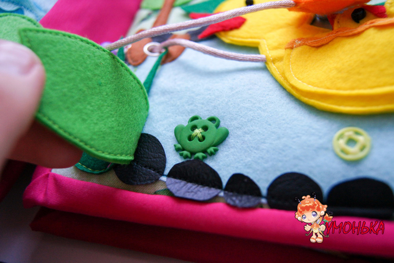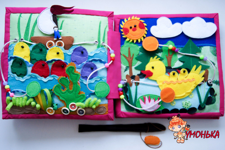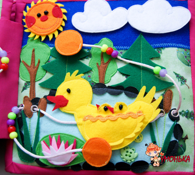 Пруд. Уточка на такой же перетяжке, как и кораблик на прошлой страничке. Детки уточки крепятся на кнопочки, они снимаются и кладутся маме под крылышко, которое выполнено в виде кармашка. Солнышко и облачка на липучках.