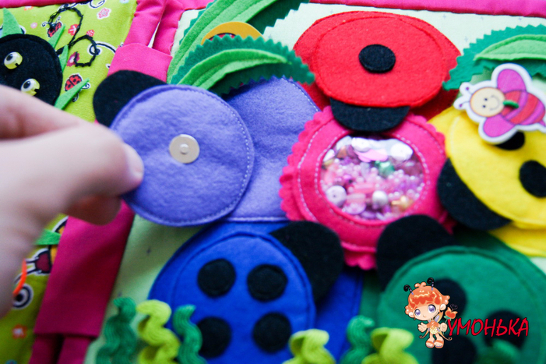 Развиваемые навыки: во-первых, изучение основных цветов. Во-вторых, магнитные кнопки способствуют развитию мелкой моторики. И плюс можно устраивать ролевые игры! Например, ночь наступила - мамочка зовёт деток спать. Скорее собери их и посади к мамочке в карманчик. Утро настало - детки вышли погулять, каждый - на свой лепесток. На каждой божьей коровке количество точек от 1 до 5. Отрабатываем порядковый счет, состав числа.