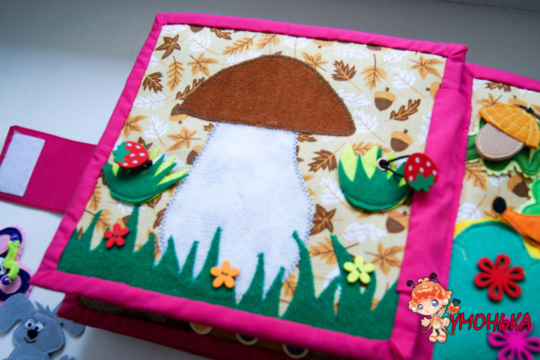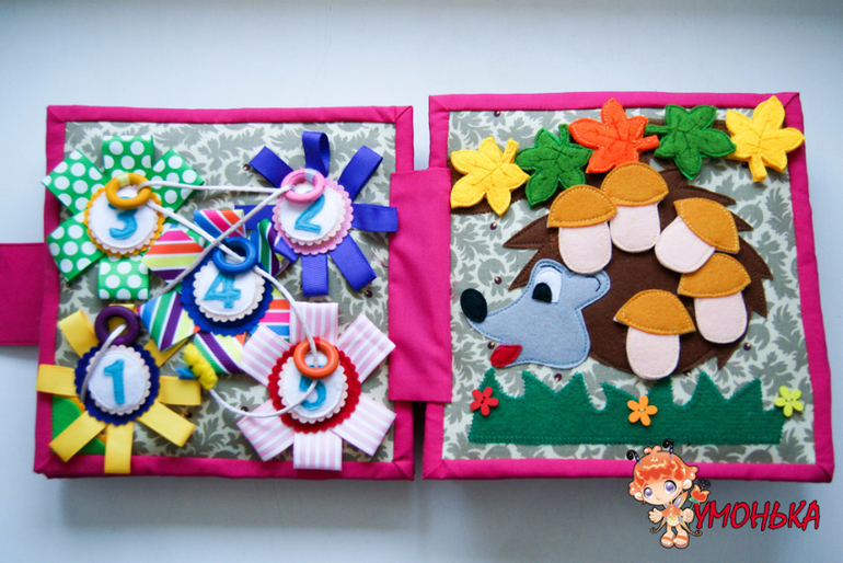 Ёжик с грибочками. Сюжет посвящен счету до 5: на страничке 5 грибочков и 5 листочков. Грибочки и листочки крепятся на липучку, которая весело хрустит! кроме того, игры с липучкой - это один из проверенных способов развития мелкой моторики.