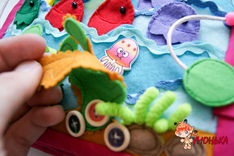 Пчёлка летает с цветка на цветок. Это - сюжет со шнуровкой. Задача протолкнуть маленькую пчелку в колечко - непростая для малыша! Он тренирует усидчивость, внимание, а, заодно, маленькие пальчики готовятся к более сложным упражнениям: к классической шнуровке. Здесь же - ролевая игра: помоги пчелке облететь все цветочки и собрать нектар. Цифры - на липучках. Более сложная для малыша задача (для более старших деток) - продеть пчелку в колечки по порядку, который задаст взрослый (прилепив цифры от 1 до 5).