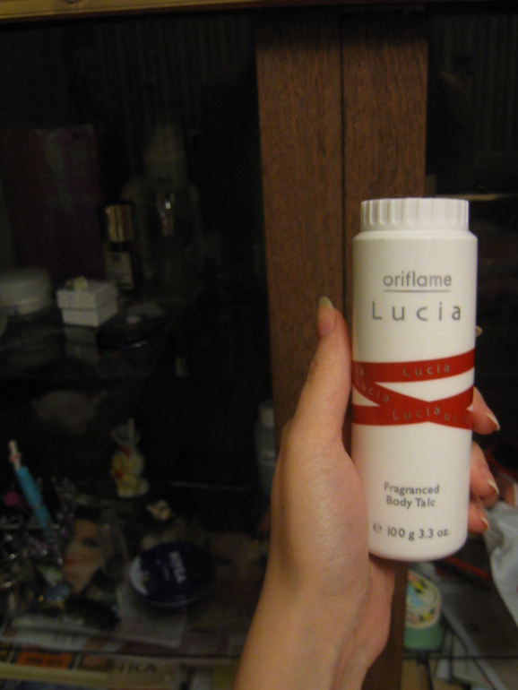 1) Парфюмированный тальк для тела Oriflame Lucia. И я, похоже, уже влюбилась) Туалетную воду Lucia я еще не пробовала, хоть ее и расхваливают, захотела вот тальк и все