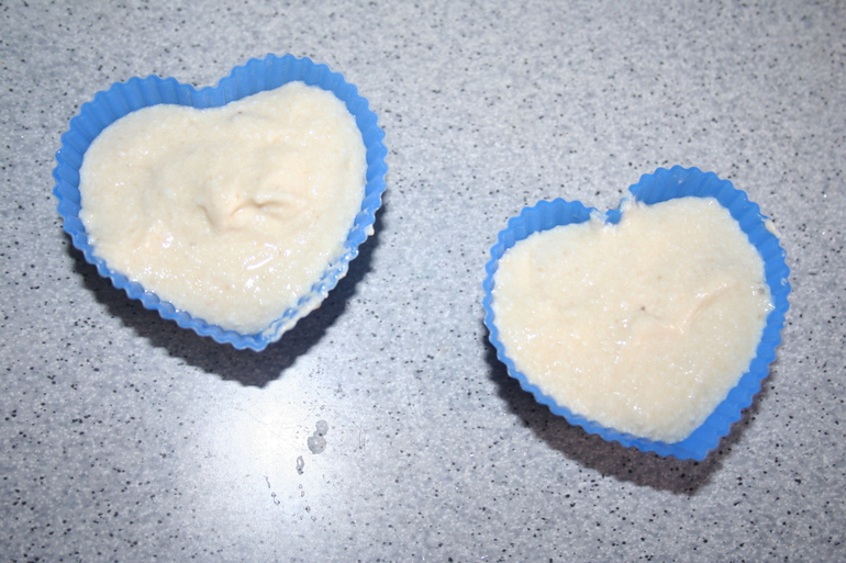 Жидковатое тесто нужно перелить в формочки, лучше не фигурные. Если не уверены в вашей форме, можете смазать ее слегка оливковым маслом, перед тем как заливать тесто.