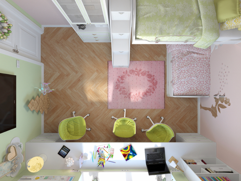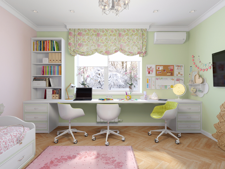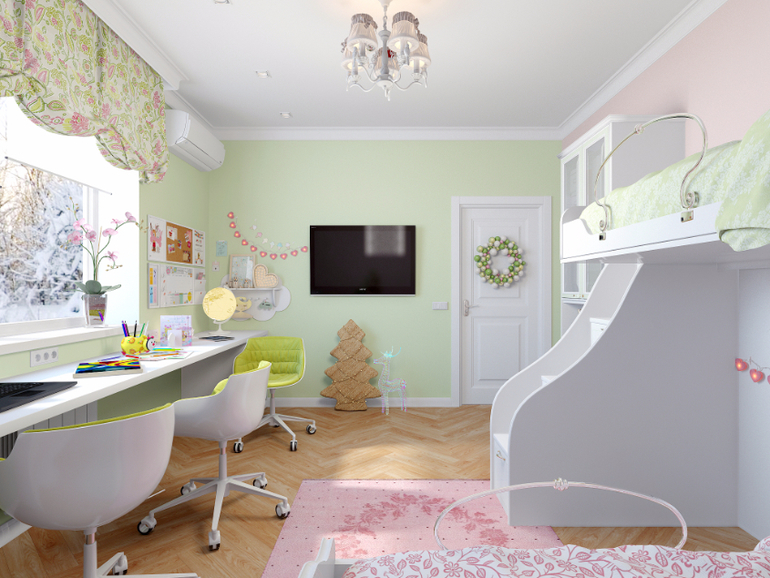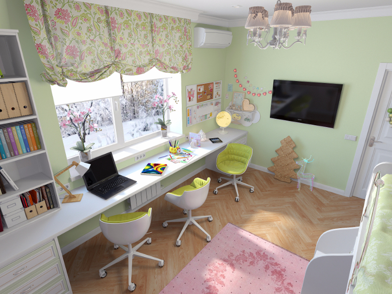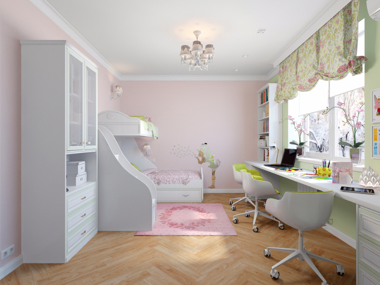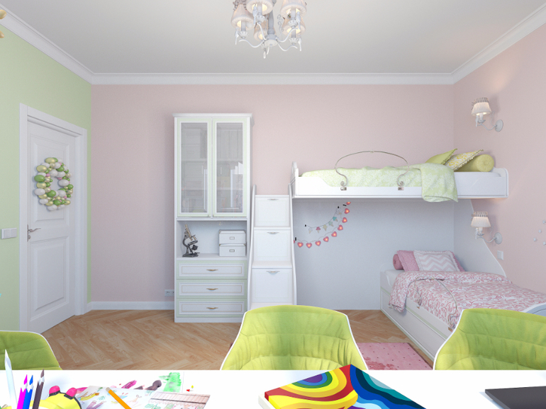 А вот и детская для трех девочек. Необходимо было вместить 3 спальных места, большое рабочее место, небольшой комод для нательного белья и стеллажи для хранения учебников, тетрадей рабочих, канцтоваров. Для вещей выделена отдельная гардеробная.