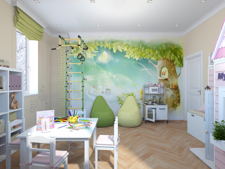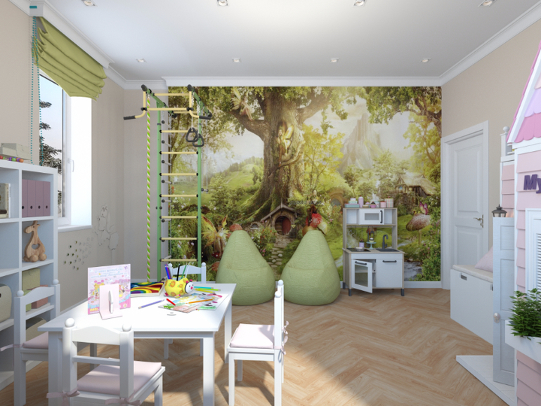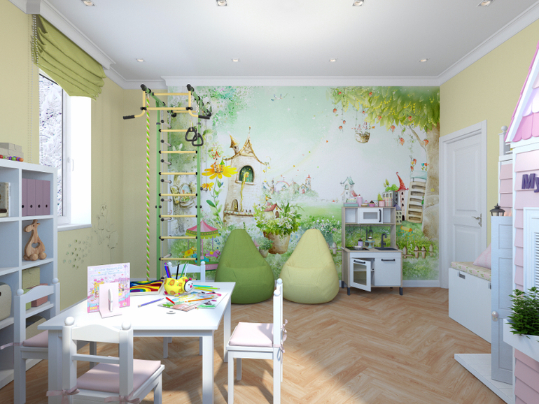 Мне очень повезло выполнить отдельную игровую комнату для девочек! Обычно на такую комнату места не хватает, но в одном чудесном доме местечко нашлось!) И вот что получилось в итоге!