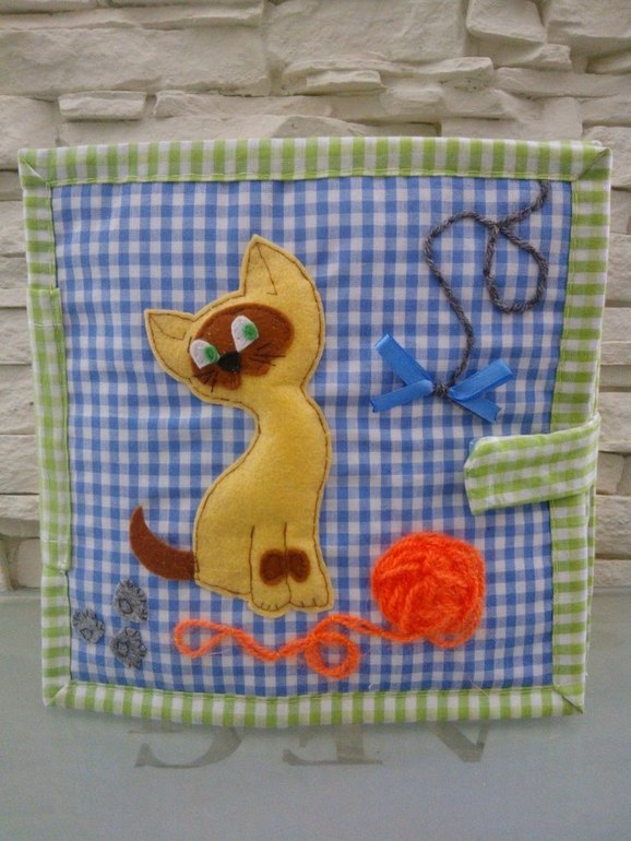 Привет! Давно читаю, но пишу первый раз! Закончила развивающую книжечку для деток от 1,5 лет. Книжка получилась толстенькая 8 см. в застегнутом виде, размером 22*22 см, 12 страниц.