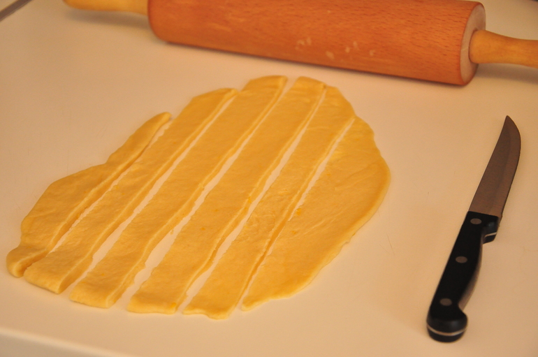 Часть осташегося теста нужно раскатать в толщину 0, 5 мм и нарезать на полоски.