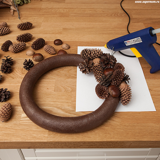 Для венка вам понадобятся: основа под венок, клеевой пистолет, коричневая краска (лучше акриловая), кисть, малярный скотч, заготовки для приклеивания: шишки, желуди и пр.