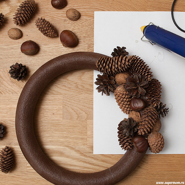 С помощью клеевого пистолета аккуратно приклеиваем шишки друг за другом, укладывая их в одном направлении. Сначала приклеиваем только крупные элементы, равномерно распределяя и чередуя их: шишки, грецкие орехи, каштаны. Когда основное пространство будет заполнено, начинаем заполнять пустоты более мелкими деталями: кофейными зернами, бадьяном и пр.