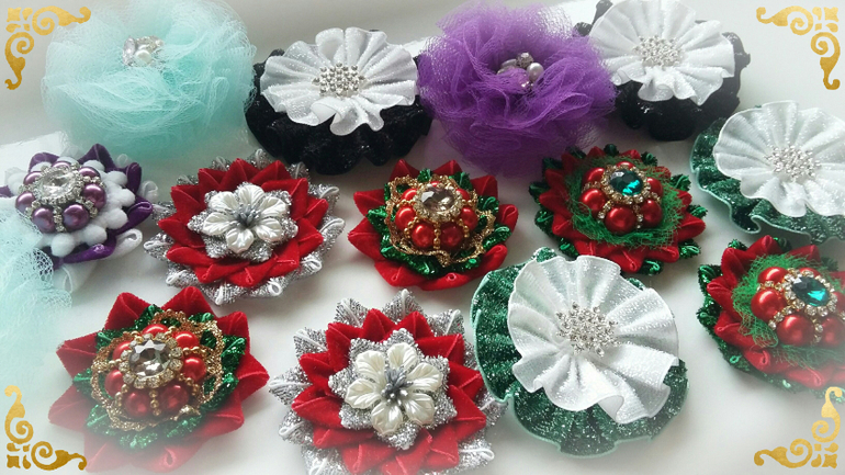 Увидела я тут недавно пост Татьяны тут с НГ красотой из бархатной ленты и очень захотелось тоже такие сделать. Первым был фиолетовый, а потом уже понеслось ))) Делала их из бархатной ленты 6 и 10 мм (блестящая это тоже бархатная лента, но с люрексом). Еще есть парочка заколочек из фатина. Много фото под КАТом :