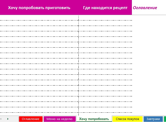 Так же есть табличка для блюд, которые мы хотим попробовать приготовить, там есть место куда вписать название блюда и место где находится сам рецепт (то ли ссылка на сайт или название книги\журнала).