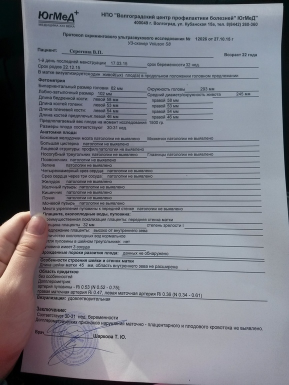 Сегодня съездили на узи с доплером-все хорошо, у нашей девочки нового ничего не выросло )))Плацента поднялась,кровоток в норме, приняли головное положение )))) Описать не могу как я счастлива! !!Узист Шаркова Татьяна Юрьевна очень хороший специалист и на позитиве )))Показала мужу личико дочи,по весу сказала что папина дочка,тк папа родился 2900 , и дочь сейчас 1500 всего )))