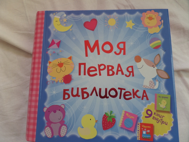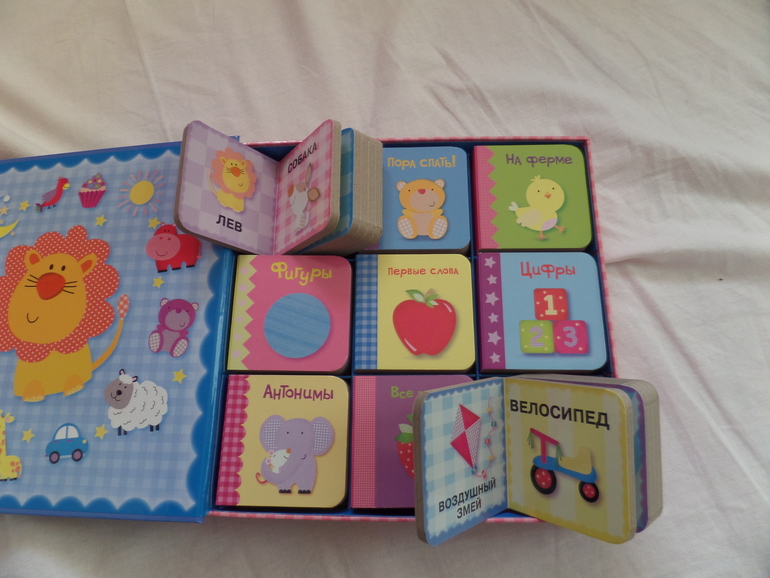 В эту замечательную коробку-библиотеку вошли девять мини-книжек. Их очень удобно держать в руках маленькому ребёнку, а яркие картинки обязательно привлекут его внимание. С помощью этих книжечек ребёнок познакомится с самыми простыми предметами и важными понятиями.