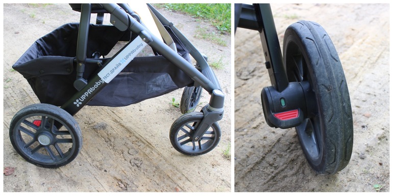 Данная модель коляски оснащена широкой рамой с четырьмя колесами. Два передних колеса являются поворотными и имеют кнопки фиксации в неподвижное положение. На заднем правом колесе коляски UPPAbabyVistaрасполагается педаль тормоза, одним нажатием на которую коляска принимает неподвижное положение и точно таким же нажатием на педаль тормоза коляска снова становится подвижной. На кнопке тормоза имеется индикатор, позволяющий понять, в подвижном или неподвижном состоянии в данный момент находится коляска (зеленый цвет - подвижное состояние, красный цвет - неподвижное состояние).