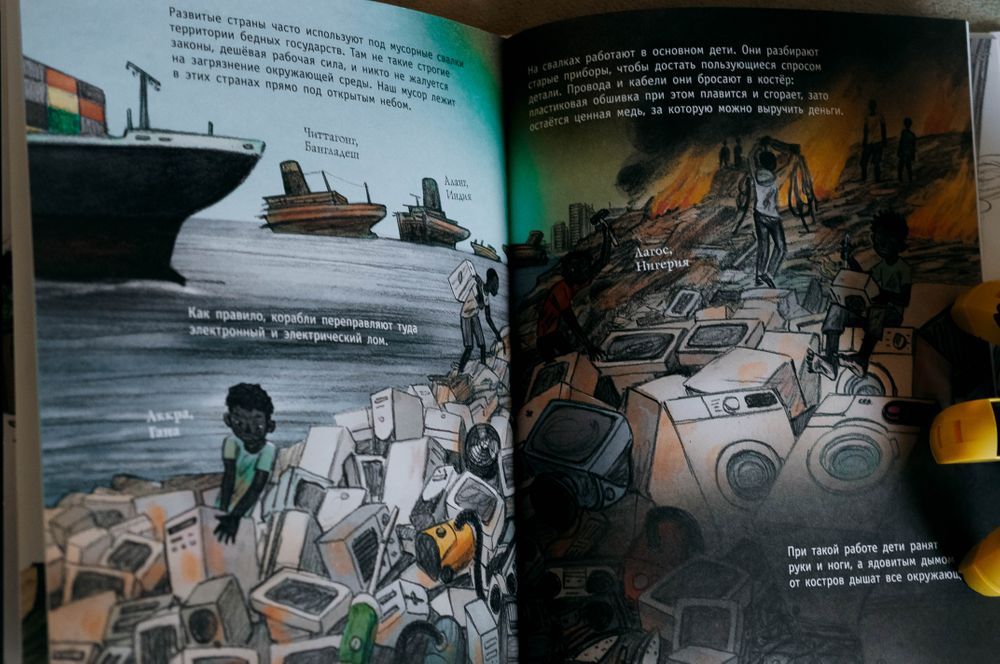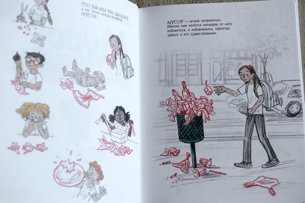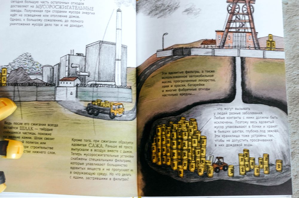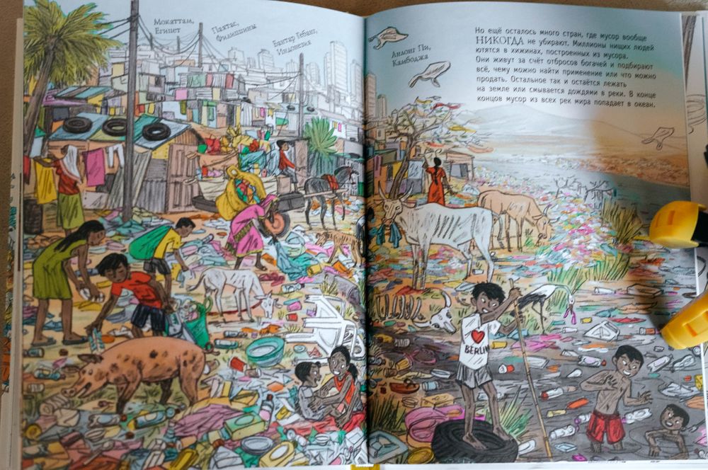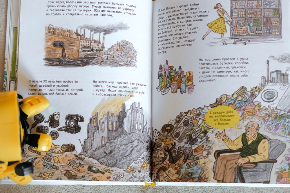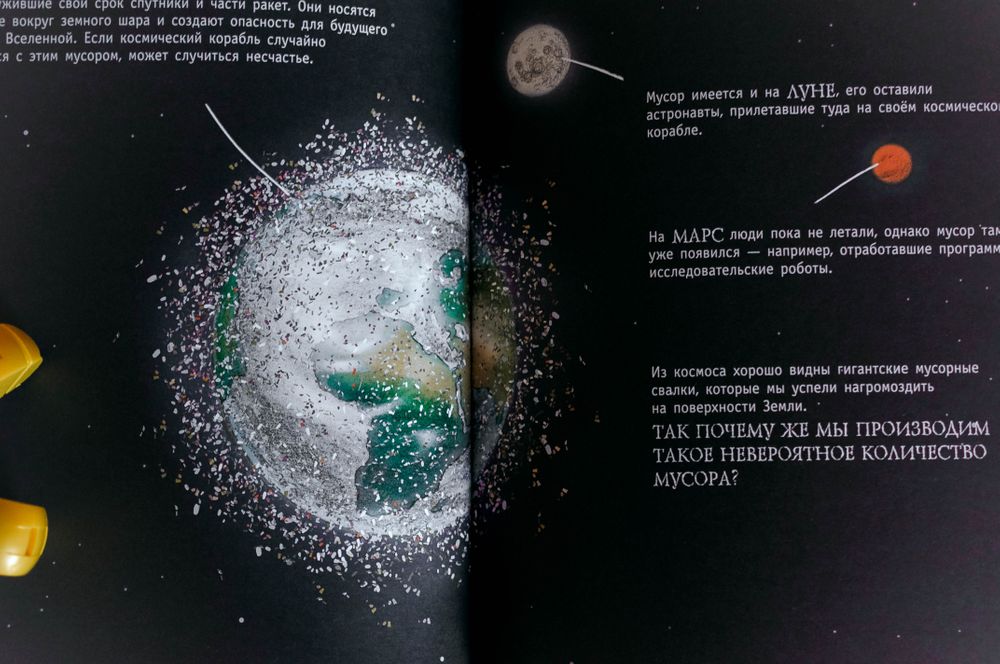 Крупный шрифт, текста не очень много, иллюстрации везде -она может быть и на самостоятельное чтение. Рассказывается откуда появился мусор, как его утилизируют, захоранивают.. Мусор - недавнее бедствие человечества, но все более "заселяет" нашу землю и даже другие планеты. Написано легко, но впечатляет тема очень сильно. Чувствуется насколько все это глобально.