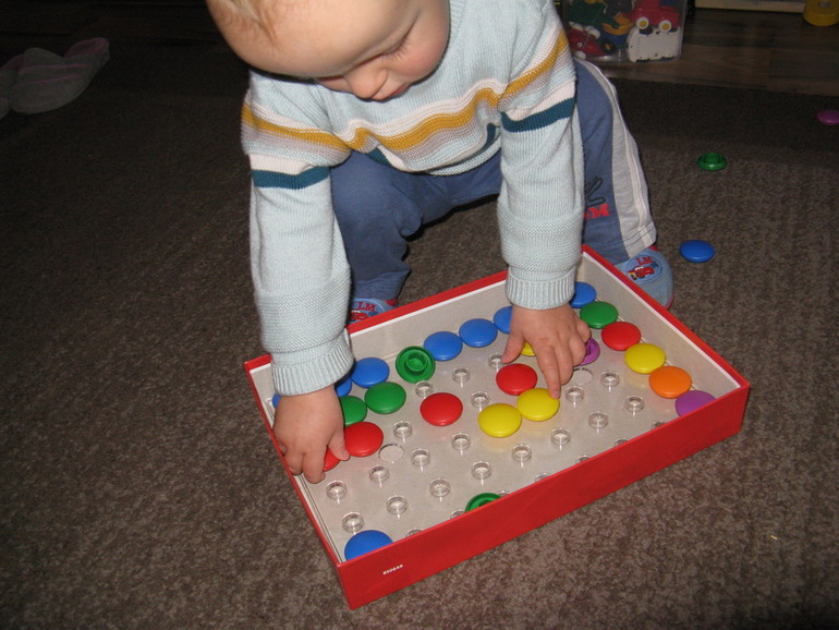 Один из малышей справлялся легко, а второй даже не заинтересовался. Его больше привлекало выкладывать-складывать мозаику из тарелки.