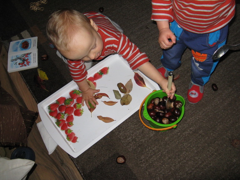 Но на самом деле им не удавалось подцепить ложкой каштан как нужно, и одного из малышей это порядком нервировало. Иногда шли на хитрость, и клали рукой каштан в ложку. Но все равно старались)