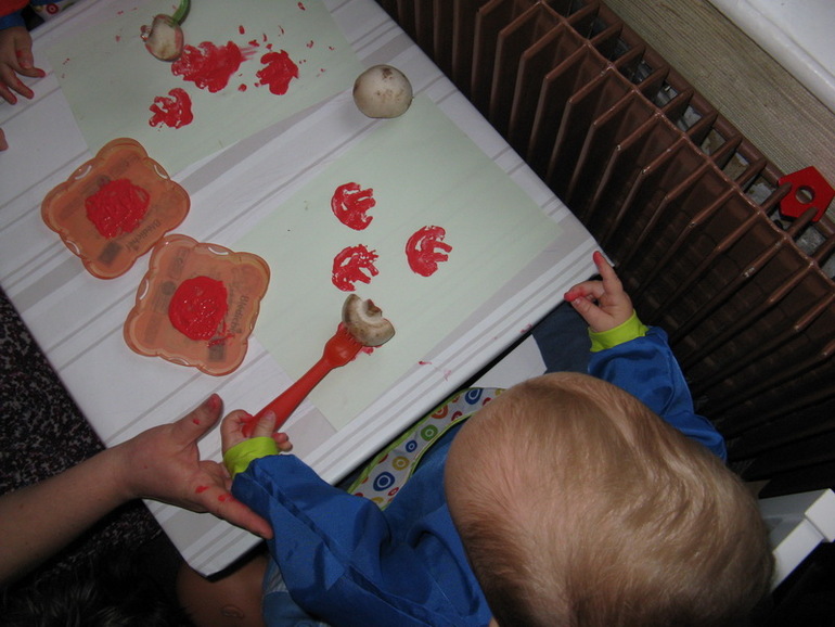 Дело как-то не очень пошло, так как один из малышей не любит «грязных рук», поэтому я ему выдала вилку, на которую можно нанизывать гриб, и кисточку. Второй тоже сразу заинтересовался таким способом.