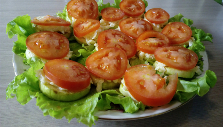 Кабачки (2 штуки среднего размера) порезать на кружочки, очистить от кожицы. Посолить, поперчить и обжарить до золотистой корочки. Потереть сыр (200 гр.),добавить туда 2 зубчика чеснока и заправить не жирным йогуртом (у меня активия обычная), кто любит,можно и майонезом. Перемешать и получившуюся смесь выложить на кабачки. Сверху выложить кружочки помидора.