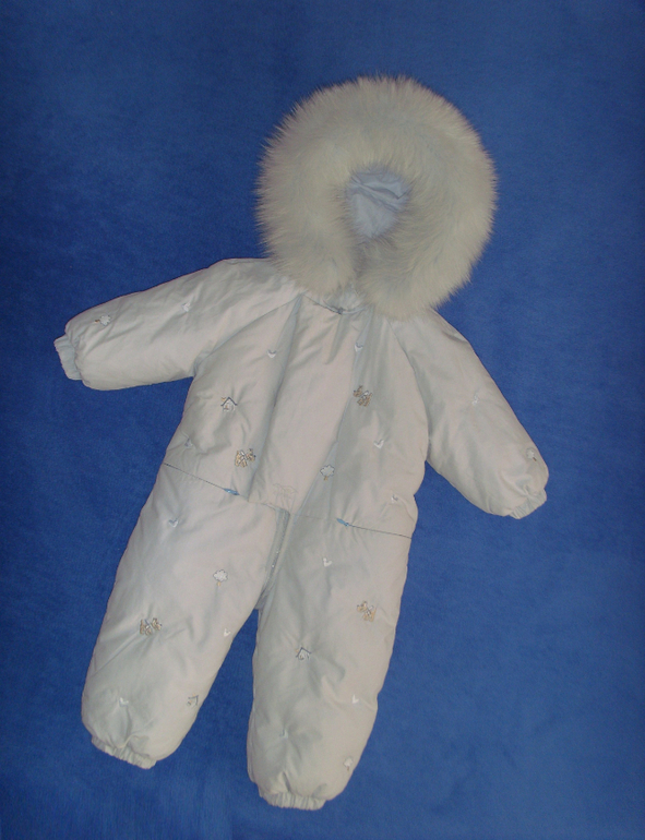 Комбинезон очень - очень теплый, мех очень густой, натуральный, съемный. К комбинезону есть шапочки и комплекты (шапка/шарф) с натуральными, красивыми меховыми помпонами. Цвет шапки и шарфа белоснежный, фото сделано вечером при свете поэтому и оттенок получился кремовый.