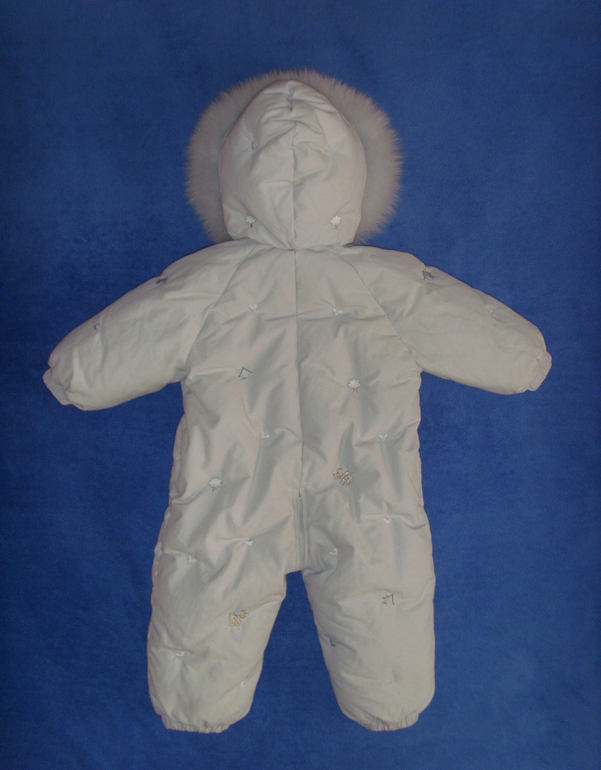 Комбинезон очень - очень теплый, мех очень густой, натуральный, съемный. К комбинезону есть шапочки и комплекты (шапка/шарф) с натуральными, красивыми меховыми помпонами. Цвет шапки и шарфа белоснежный, фото сделано вечером при свете поэтому и оттенок получился кремовый.