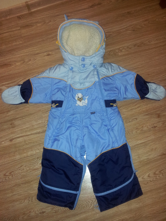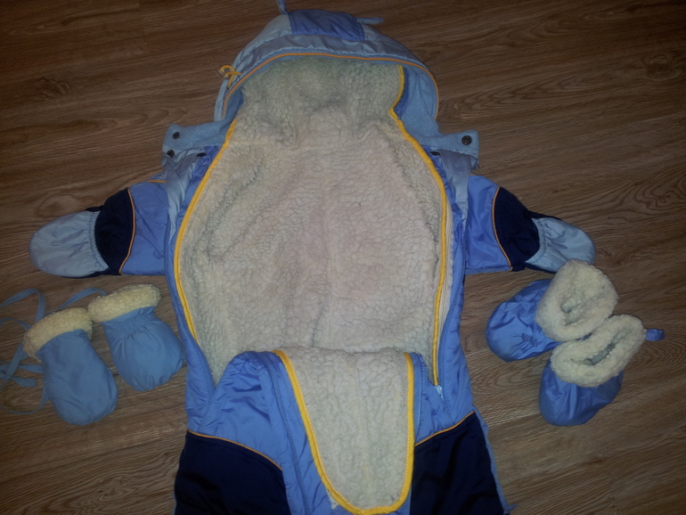 Комбинезон на овчине. Подстежка отстегивается. Ножки и ручки можно завернуть пока ребенок маленький.