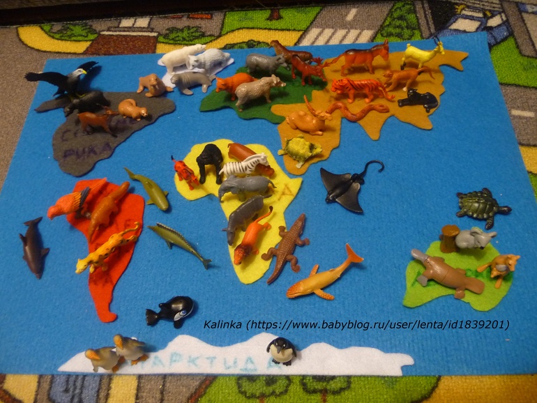 Начну с того, что фигурок животных у нас очень много, но они маленькие (около 4 см). Большая часть из них приобреталась отдельными наборами, часть покупалась поштучно, часть извлекалась из киндер-сюрпризов. Играем мы ими не часто, т.к. игры получаются глобальными, масштабными и долгими. Вариантов игр не много. Расскажу для начала о моей любимой игре. Задумывала ее я давно, а вот доделала совсем недавно. Есть у нас коврик голубого цвета от ковролинового конструктора. "Чем не океан?" - подумала я и решила вырезать из фетра континенты. Проблемы возникли только с Арктикой. Как изобразить всю Арктику я не знала, потому вырезала только остров Гренландия.Вот так и появилась у нас Карта мира для наших животных.