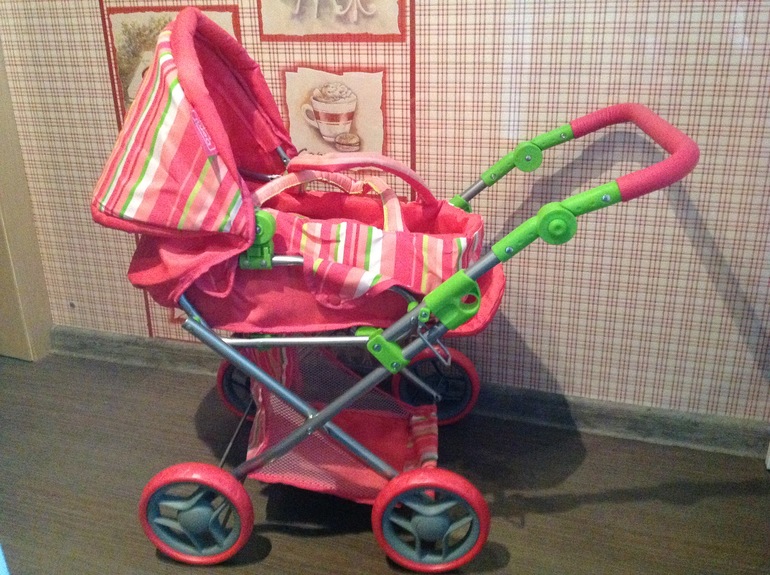 Вчера все таки купила эту колясочку для моей малышки. Коляска хороша. Колеса из вспененой резины, спинка, подножка и капюшон регулируются в разных положениях, текстиль съемный, можно и постирать, имеется корзина для "покупок". Ну прямо как настоящая коляска! В общем я очень и очень довольна приобретением. Тем более вопрос кукольной коляски у нас уже стоял очень остро, а тут такой подарок от детского мира за 800 с хвостиком.