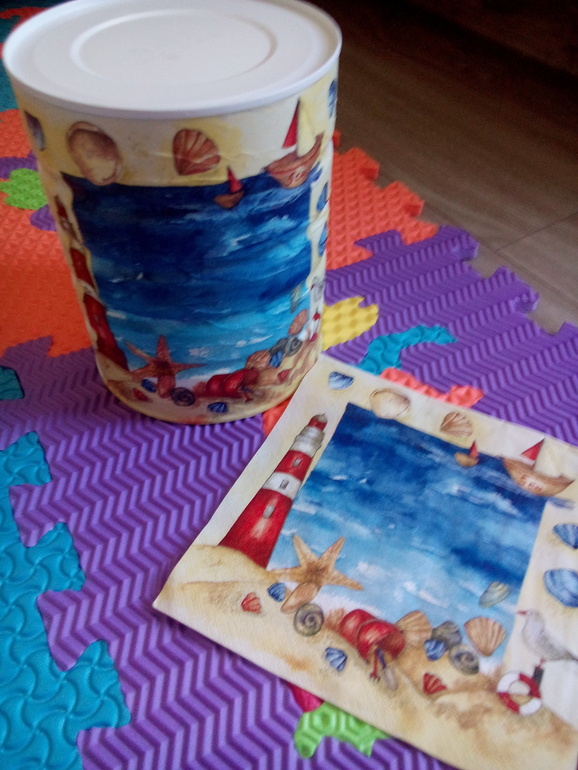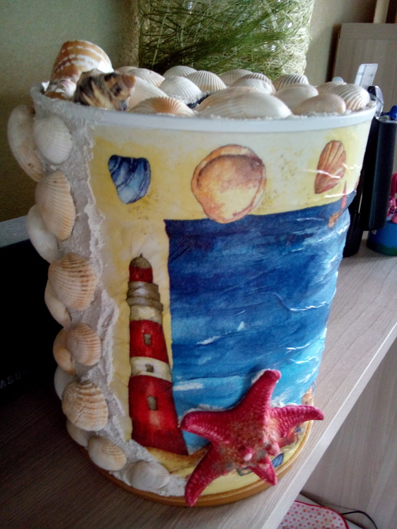 оказалось что сделать копилку очень просто: сначала мой дорогой муж выпили отверстие для денюшек, потом банку я обезжирила и нанесла белую краску( которая буквально за 15 минут полностью высохла), после начался аккуратный процесс декупажа и покрытие матовым лаком уже наклеенную и высохшую готовую морскую композицию, под конец дело осталось за малым: нанести декорактивную пасту на свободные участки банки и приклеить ракушки)))