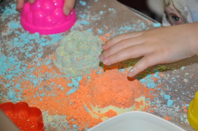 Если соблюдать точные пропорции, то получится рыхлый песок, просто нужно хорошенько руками перемешать. Попробуйте, экспериментируйте! Вам и Вашему ребенку точно понравится)))