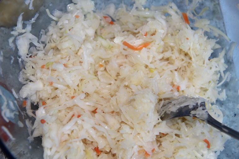 Режем мелкими кубиками лук. Капусту хорошо отжать (капустную водичку не выливать)
