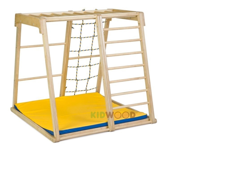 Скаладром, горку,кольца, веревочную лестницу, трапецию, качели, баскетбольное кольцо, массажную дорожку (на ней сзади секции на замочках. Я туда разной крупы насыпала. Сын её обажает и стирать можно. Она на липучках с спорткомплексу крепится.