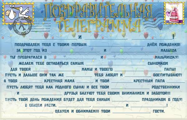 Заранее заготовить бланк «Телеграмма», попросить всех гостей по очереди называть любые прилагательные и вписывать их в текст, потом зачитать что получилось!