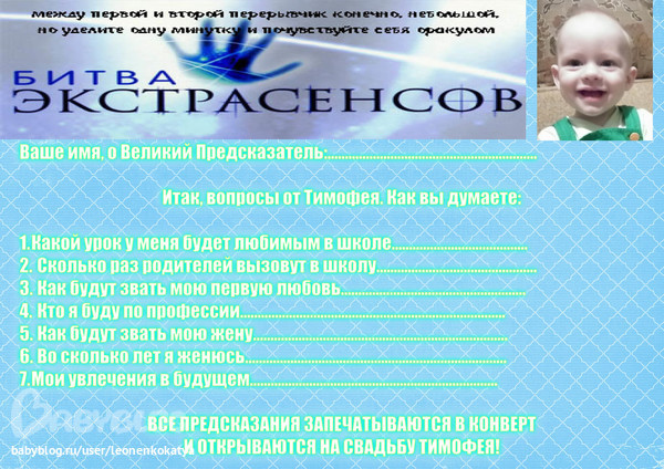 Приготовьте заранее анкеты, в которых гости напишут пожелания для вашего маленького именинника. Назовите их «Анкета». После праздника положите анкеты в конверт, и подарите ребенку на его 18-тилетие. Ему будет очень интересно почитать, кем же его видели в будущем.