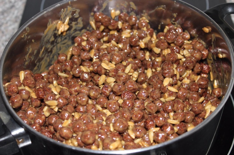 Масло и ирис растапливаем на огне до однородной массы и всыпаем туда семечки