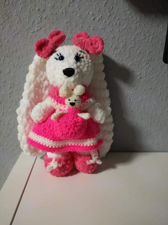 Эта зайка скоро поедит в новый дом, но я так к ней привязалась, что думаю свяжу такую же игрушку для Сабринки.