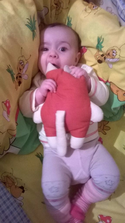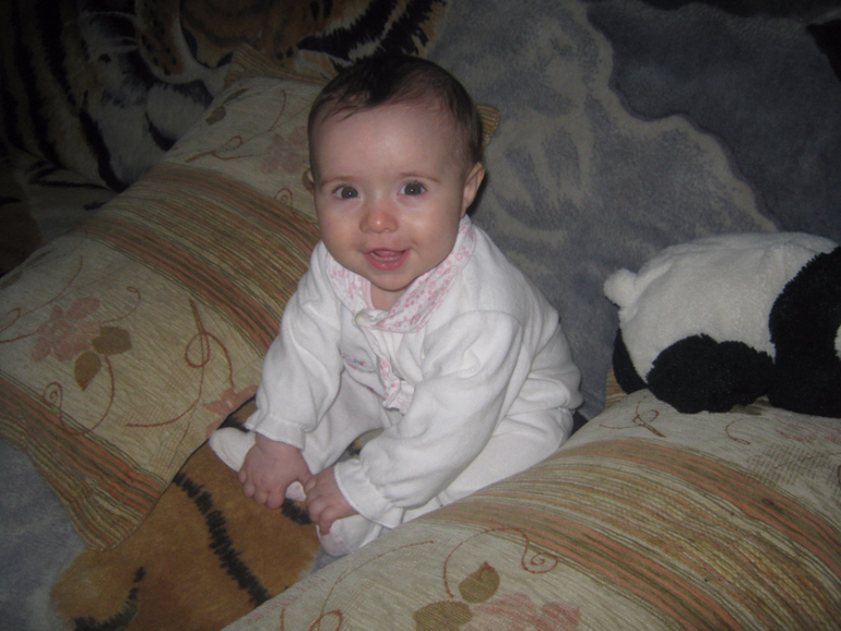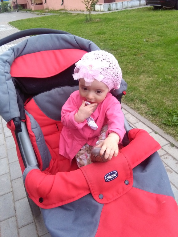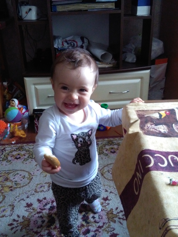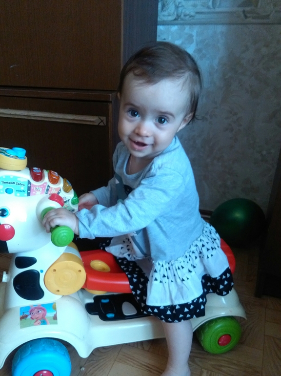 Как быстро летит время, как многому она научилась за этот месяц. Мы освоили наконец-то ползание, научилась вставать у опоры и стоять возле нее, научилась вставать с положения лежа и садиться тут же, очень любит резко присесть, когда только проснется, любит по утрам будить старшего брата в школу, когда тот совсем не хочет вставать, любит кататься на детских машинках, лошадках и т.п. Растет активная, постоянно улыбающаяся малышка, но с характером и требовательная, любит песни петь, особенно на улице, если не спит.