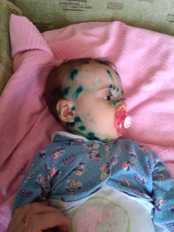 Вот, не думала, не гадала, что в таком раннем младенчестве мы ее словим. До этого был контакт с соседским мальчиком, он за неделю до нас переболел, вот и нам досталось. Заметила первые высыпания я 20 мая, Ульяше было 9 месяцев и 9 дней. Сегодня 4 день, высыпаний очень много на голове, лице, шее, в паховой области, на пояснице, не много на животике и спинке. В третью ночь была температура, потом сбила и поднялась ещё к вечеру следующего дня - 37,5, потом сама упала, больше пока не поднималась. Ночами спит не очень хорошо, но утром досыпаем. Мажу зеленкой, даю антиокс, детокс, пакс, юниор, пассилат, урсул, ревьен. Днем спит хорошо. Все было бы не плохо, если бы не чесалось сильно, но, вроде бы, уже идет на спад.