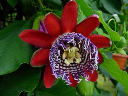 Быстрорастущая лиана, цветение обильное. Листья лопастные. Цветки крупные, бордового цвета, диаметром до 8 см, 5-членные, околоцветник-желтый. Своей формой они похожи на звезду — отсюда другое название растения — кавалерская звезда. Цветки, кроме своеобразной формы, имеют легкий аромат. Между околоцветником и тычинками расположена корона из лучевидно расходящихся узких долей, окрашенная в сиреневый цвет. Тычинок обычно 5, завязь иногда с 3 столбиками.