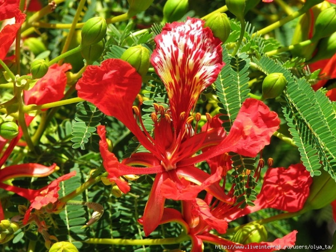 Родиной Делоникса королевского является территория острова Мадагаскара, Южной Африки, Аргентины и Индии. По внешнему виду листьев делоникс напоминает акацию. Цветки крупные, зигоморфные, обоеполые, собраны в многоцветковые кистевидные соцветия верхушечные и пазушные. Четыре лепестка одинаковые алого или лососевого цвета, по 5-8 см длиной. Верхний, пятый лепесток (предназначен для привлечения на перекрестное опыление насекомых) отличается окраской - ярко желтого или белого цвета, с крапинами. Тычинки короче лепестков. Чашелистики также ярко окрашены. Цветение на третий год.