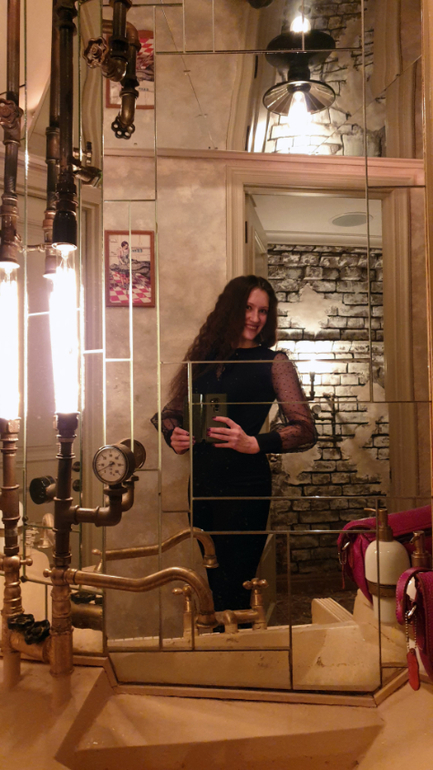 Я аж застеснялась, рядом с такой звездой соцсетей. Подготовилась и отправилась фотографироваться. Разумеется, как положено, в самое красивое место ресторана с большим зеркалом - в туалет.