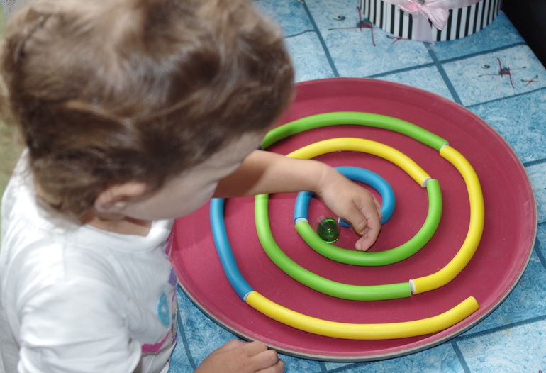 1. Лабиринт. Крышечки от фрутоняни наклеены на двусторонний скотч, так что ребенку просто так их не оторвать! - попытки были))