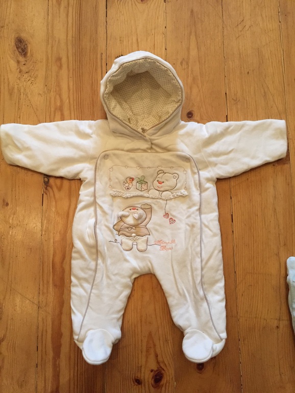 Покупали на выписку в мае. Молочный комбинезон только постирали(не носили!). Нежно-голубой - одели один раз на выписку. Цена каждого 600 руб.