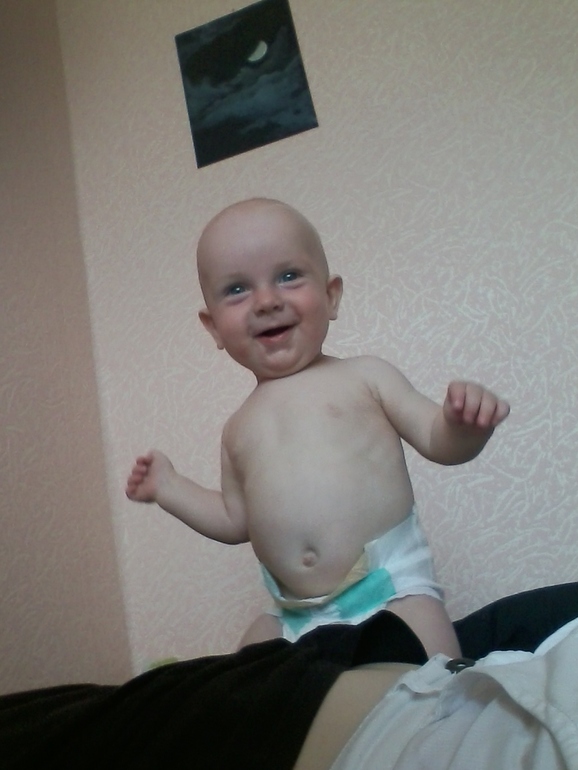 А поначалу так страшно было мне! Когда первые разы садиться стал - на ножку присел, перенес вес с опорной ноги под себя, спинку держит ровно-ровно! Образец хорошей осанки просто! Руками помогает балансировать, а сам покачивается, как загипнотизированная змея из корзинки. Несколько раз замечала, как одной из свободных рук веера крутил. И так, и эдак. И смотрит на руку, что ещё и так вот можно) ну и падать норовит, потому и страшно. Собственно, тут и началась наша пора падений. Вот первый раз с матраса упал, когда начал ползать кое-как шустренько, кажется это было 20-22 апреля. Помню, что перед днем рождения моего отца,я ему про это рассказывала. А теперь падает сам, без всяких там матрасов. Своей высоты теперь хватает.