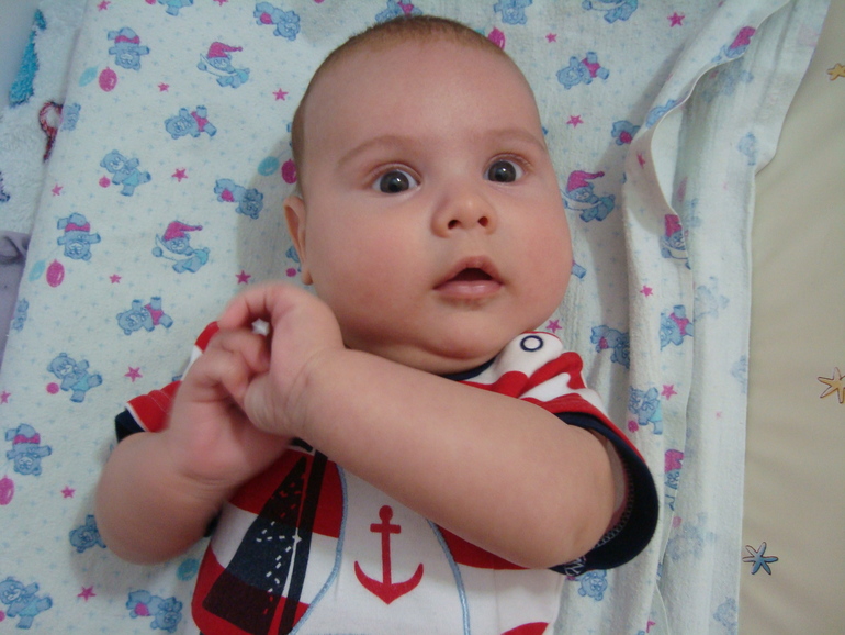 3. Научился переворачиваться на живот. Через левый бок уже шустро, через правый менее резво. Лежа на спине пытается встать на мостик приподнимая попу. Хватаясь за мои пальцы подтягивается как на турникете, из любого положения пытается сесть, так что бицуха и пресс у него уже "держись девки" ;)