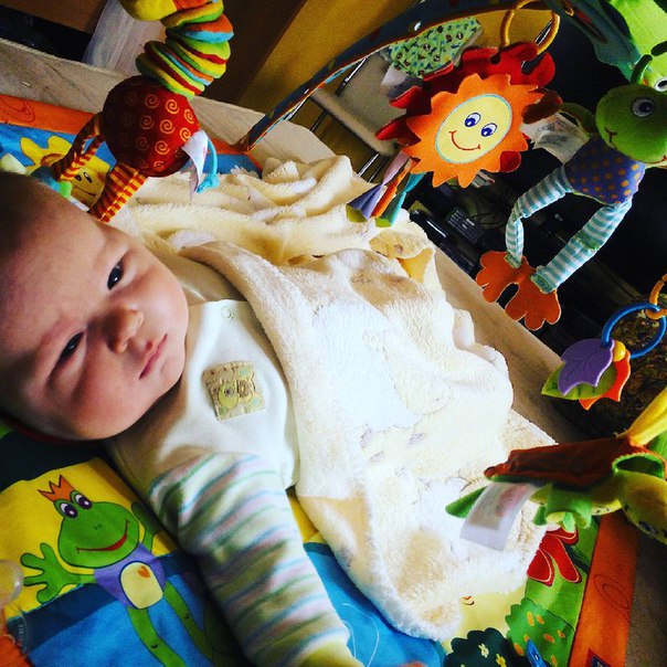 Точнее он лежал рядом со мной на кровати, где-то в 15-20 см от края, я сцеживалась, муж сидел в углу комнаты, залипал в компьютер. Слышу слева бум, поворачиваю голову - ребенка нет. С диким криком "АНДРЕЙ!!!" несусь к другой стороне кровати. Какой рев поднялся. Я успокаиваю ребенка на руках, вопреки Андреевскому "не трогай его", пока муж его ощупывает. Даня успокоился быстро, с аппетитом покушал и заснул в положенное время. В полшестого разбудил меня, как всегда, на покормку и уснул обратно. Никаких признаков сотрясения или переломов нет. Нет даже синяка. Так что каким местом он упал - загадка. От предложенной по телефону госпитализации я отказалась. Полагаюсь на свое материнское нутро, которое говорит, что он просто слегка ударился и больше испугался, так что ничего серьезного. Он у меня крепкий малыш.