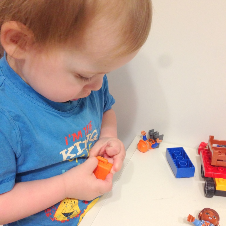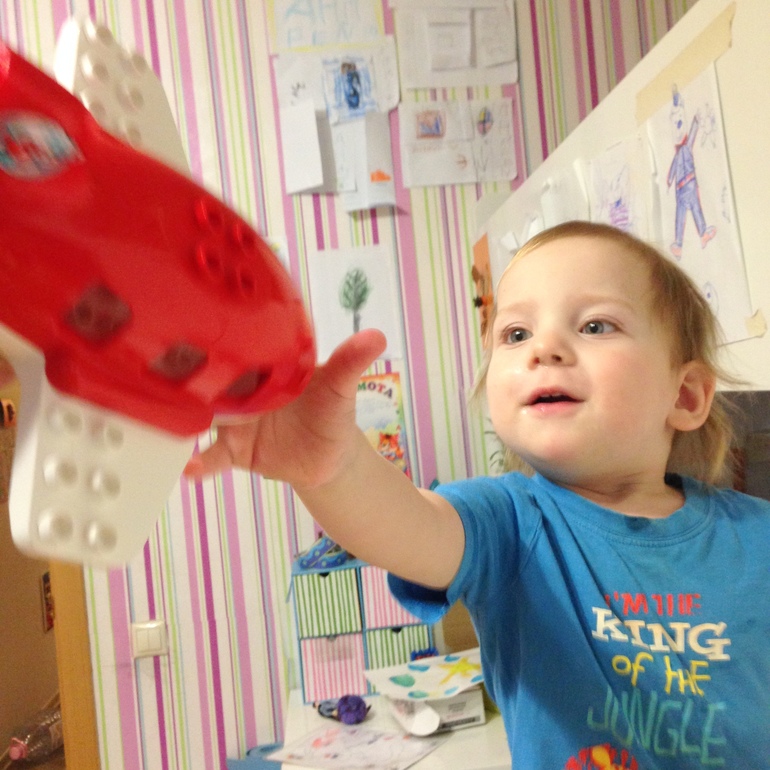 У Марка получается. Только тут такой момент. При таких занятиях для малышей надо заранее подготовить необходимые детали. Искать в куче, а после собирать по образцу - это для двухлетки будет сложно. Не говоря уж о том, что пока ребенок ищет нужную деталь, он увидит десять других интересных деталей и ваш образец/инструкция уже будет не нужен. А вот манипулирование деталями - это куда интересней для ребенка в неполные два года! В сущности, это то самое пресловутое развитие мелкой моторики. Старшие братья собрали машинку из этого набора. А Марк стал ее видоизменять. Вряд ли здесь есть цель, главное - процесс. Вот она - работа пальчиков )