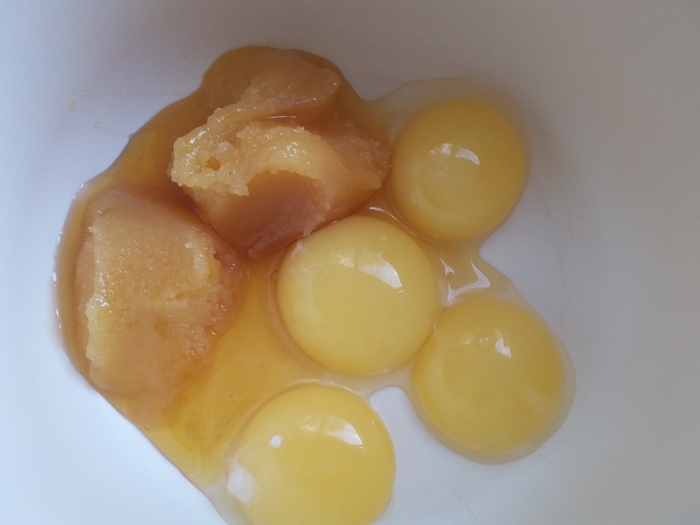 В чашу миксера поместить 4 желтка и 3 ст.л. меда: